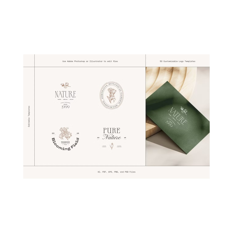 Botanical Kit عبارة عن مجموعة مرسومة يدويا من قوالب شعارات مسبقة الصنع 50x ورسوم توضيحية زهرية 140x. استخدم Adobe Photoshop أو Adobe Illustrator لإنشاء هوية علامة تجارية مذهلة. قم بتغيير أحد قوالب الشعار أو قم بعمل قالب جديد بعناصر مرسومة باليد متوافقة.