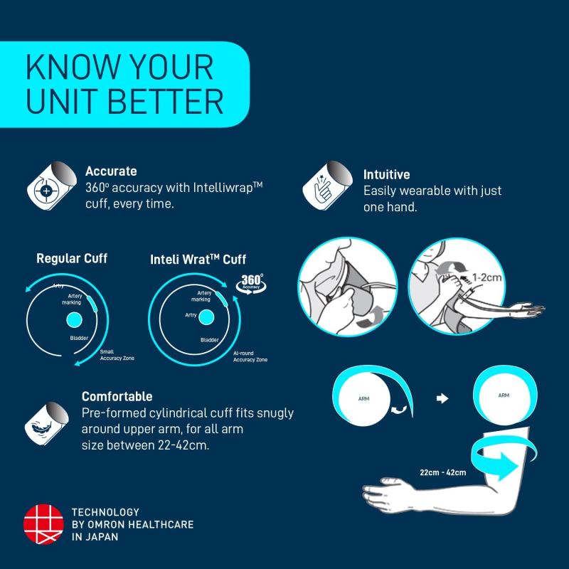 جهاز قياس ضغط الدم الرقمي الأكثر تقدما من أومرون مع سوار التفاف Intelli بدقة 360 درجة لجميع أحجام الذراع ، مما يؤدي إلى قياسات دقيقة