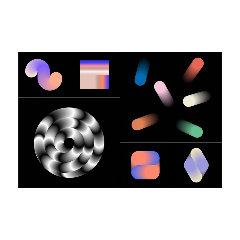 • Set of 70 gradient blend objects, from simple universal logos to quirky and funky design elements
