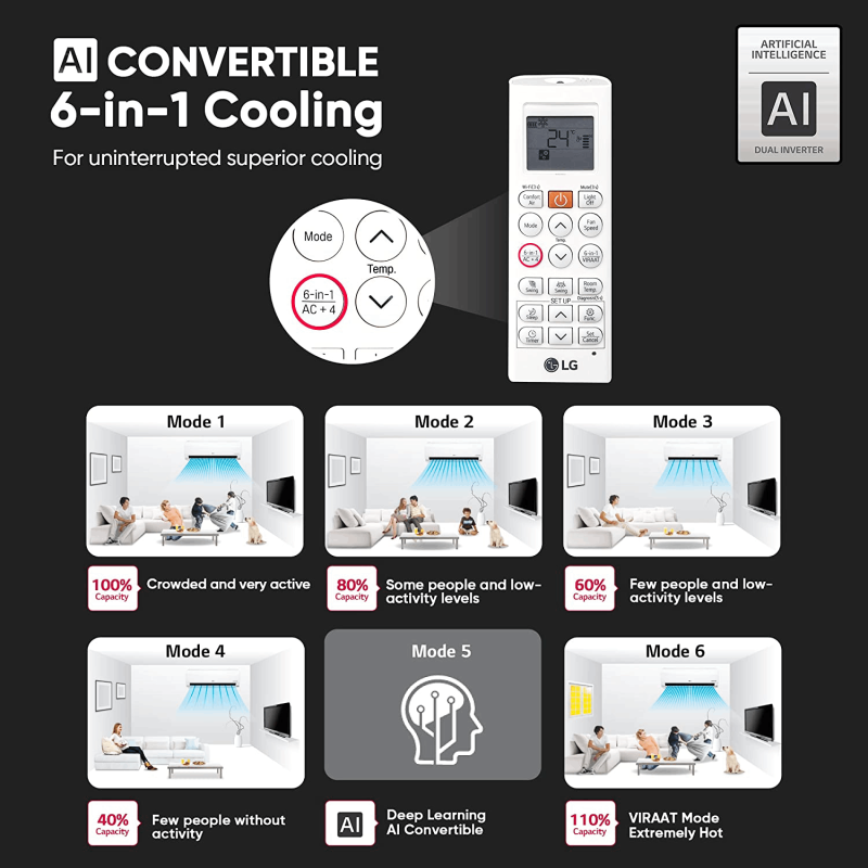• Split Ac With Inverter Compressor: Variable Speed Compressor Which Adjusts Power Depending On Heat Load |With AI Convertible 6-in-1 user gets the flexibility to increase or decrease cooling capacity as per requirements.